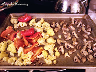 The dinner recipe was Roasted Peppers, Cauliflower, and Almonds, which looked good, but it called for Kalamata olives, which neither of us like. The problem was, if we left them out altogether, the dinner would be pretty lame. I decided that instead of getting olives, we could substitute mushrooms and roast them along with the cauliflower and peppers. That ended up being a really good change--the mushrooms were delish, and they bulked up the meal a little.
